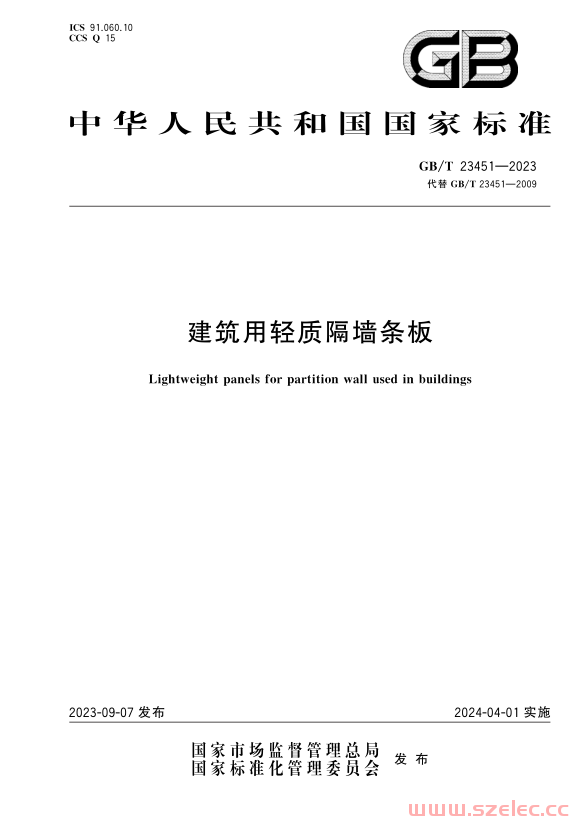 GB/T 23451-2023《建筑用轻质隔墙条板》由国家市场监督管理总局、国家标准化管理委员会于2023年9月7日发布,2024年4月1日起实施,该标准代替了GB/T 23451-2009。以下是对该标准的详细介绍:
